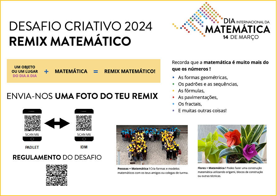 O Grupo de Matemática convida todos vós a participar no Remix Matemático, que assinala o Dia Internacional da Matemática (também conhecido como dia do Pi), celebrado anualmente a 14 de março. Com esta iniciativa, pretendemos reunir alunos, professores, pais e toda a comunidade escolar numa jornada divertida e educativa, onde a matemática assume o papel principal. Participem enviando uma foto (consultem o regulamento através do código QR presente no panfleto) e juntos daremos uma nova perspetiva à Matemática, demonstrando como ela se encontra presente nas nossas vidas de formas surpreendentes.