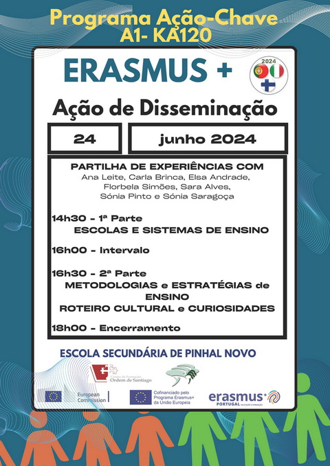 No próximo dia 24 de junho de 2024 (2ª feira), entre as 14h30 e as 18h00, realizar-se-á uma Ação de Formação de Curta Duração (3H), em articulação com o Centro de Formação da Ordem de Santiago, subordinada ao tema “Ação de Disseminação ERASMUS+” Partilha de Experiências, relativa às mobilidades realizadas em Itália e na Finlândia.